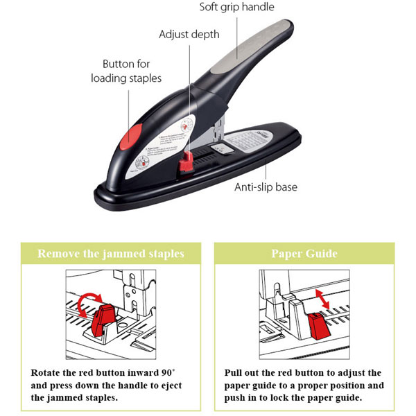 Ref. 05001 Capacidad máxima de hasta 140 hojas. Mango suave para una operación cómoda. Margen ajustable para engrapar de 9 - 59 mm. Utiliza grapas 23/6 a 23/17 Dimensiones: 320 x 88 x 177 mm