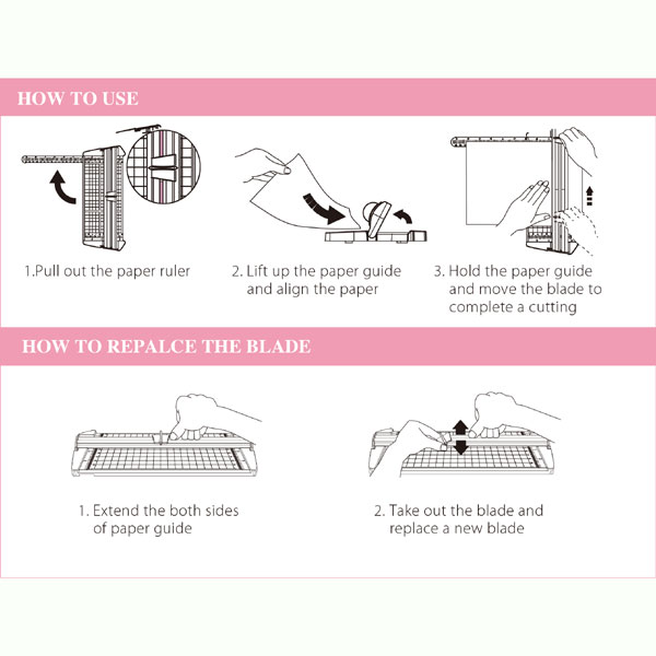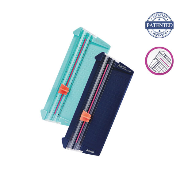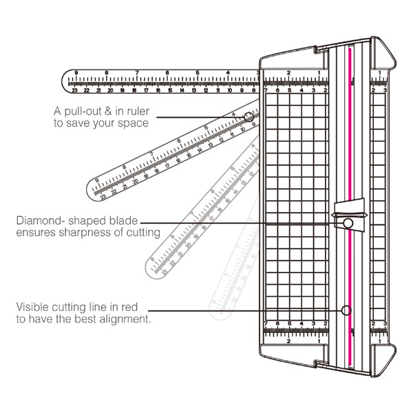 Corta hasta 9 hojas de 80 gramos. Portátil, liviana.. Línea de corte visible en color rojo para poder alinear el papel rápidamente. Asegura cortes rectos siempre. Para papeles tamaño A5. Tiene una regla que se puede sacar para medir papeles más grandes.
