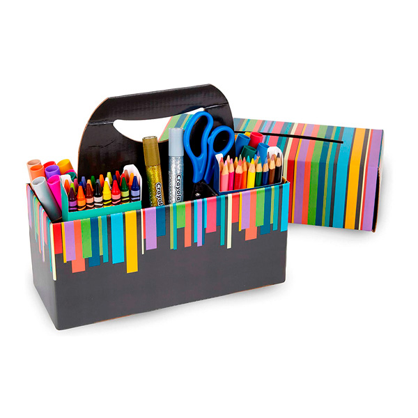18 rotuladores, 18 lápiz corto de colores, 24 crayones de cera, 2 pegamentos con brillantina, 25 hojas de papel en tamaño 4 x 6, contenedor de cartón (caddy), tijera, 15 hojas para coloreas en tamaño 4 x 6