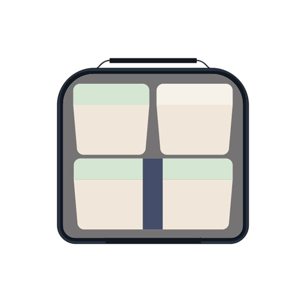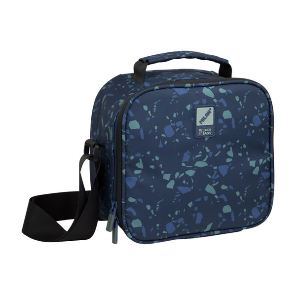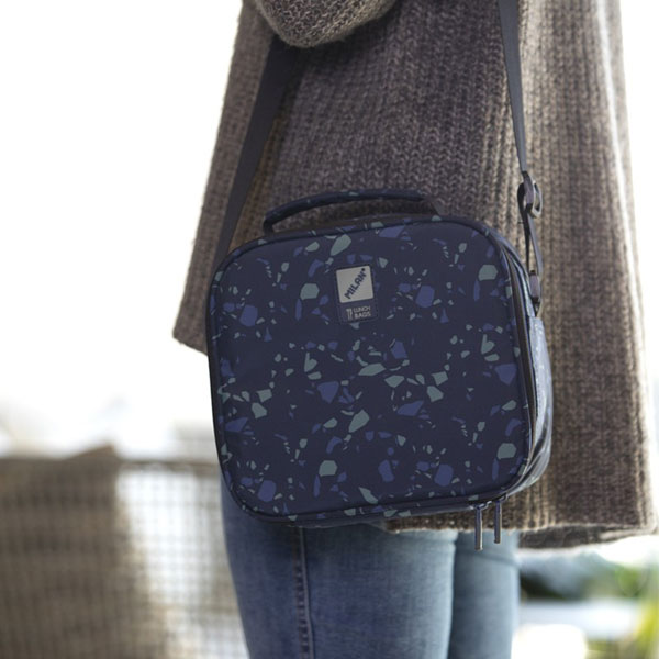 Bolsa isotérmica porta alimentos con 3 recipientes. Edición especial Terrazzo Blue fabricada con botellas de plástico recicladas, color azul marino. Interior aislante frío/calor para una mejor conservación de los alimentos. Apertura total para una mejor accesibilidad y limpieza. Práctico bolsillo interior con zipper. Correa regulable. Composición: exterior de poliéster reciclado (RPET) y forro interior isotérmico (P.E.V.A.). Medidas: 23 x 20 x 11 cm. Capacidad: 3,5 litros.