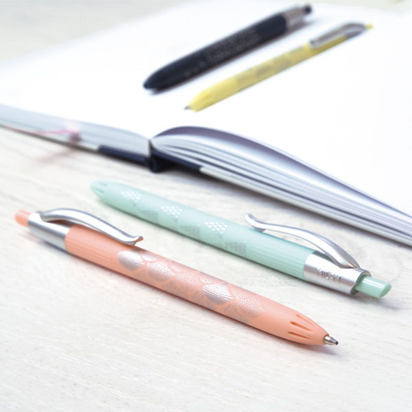 Bolígrafo P1 Edición Silver, cuerpo plateado con pinza y botón pulsador de color amarillo, rosado, turquesa o azul marino. Tinta azul. Longitud de escritura aproximada de 1,200 metros. Punta de 1 mm. Tinta fabricada en Alemania.