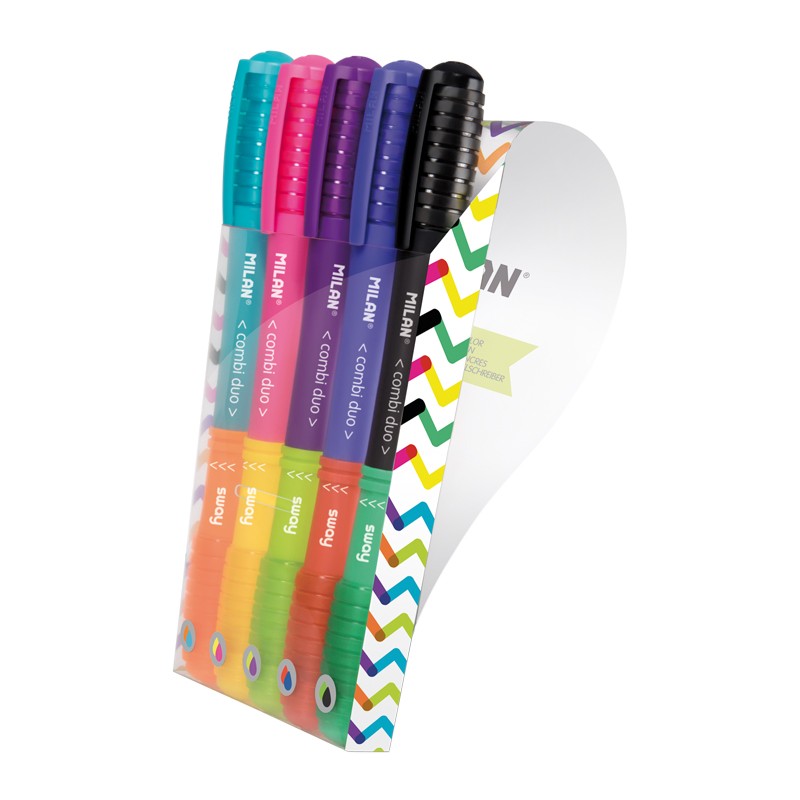 Bolígrafo SWAY Combi Duo con dos puntas fácilmente intercambiables gracias a su sitema rotatorio. Estuche con 5 bolígrafos de doble punta con 10 colores de tinta disponibles (cuerpo del mismo color que la tinta). La gama completa permite hacer hasta 25 combinaciones distintas. Longitud de escritura aproximada de 650 metros. Punta 1 mm.