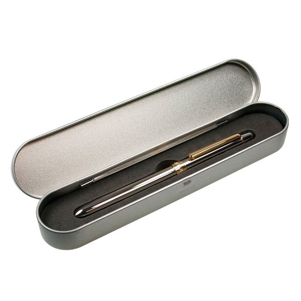 Caja metálica bolígrafo 4 funciones (goma de borrar, portaminas, bolígrafo azul y rojo)