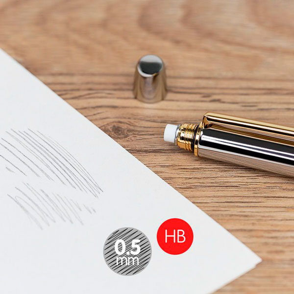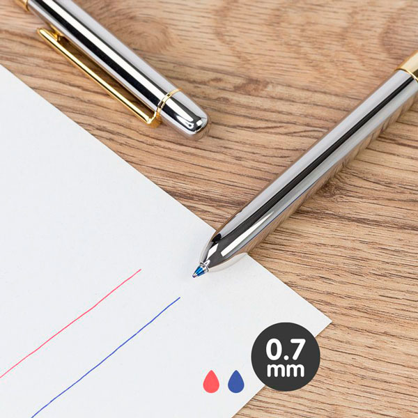 Bolígrafo con 4 funciones: bolígrafo azul 0.7 mm, bolígrafo rojo 0.7 mm, portaminas 0.5 mm HB y goma MILAN. Cuerpo de color plata cromado, aro central con logo MILAN grabado y pinza en tono dorado. La mina de las tintas lleva impreso la fecha y el año de fabricación. Fabricado en Japón. Caja metálica, ideal para regalar.
